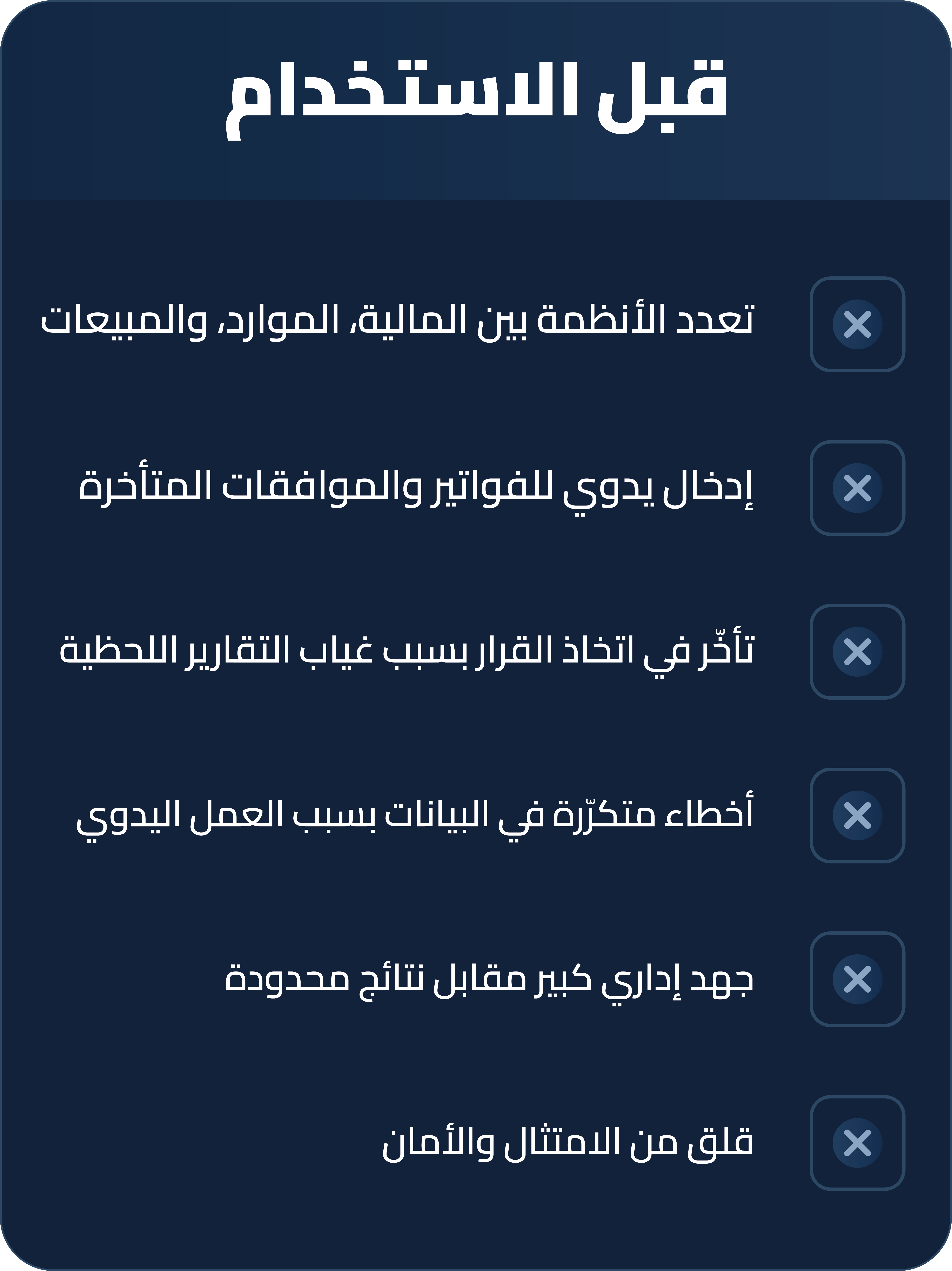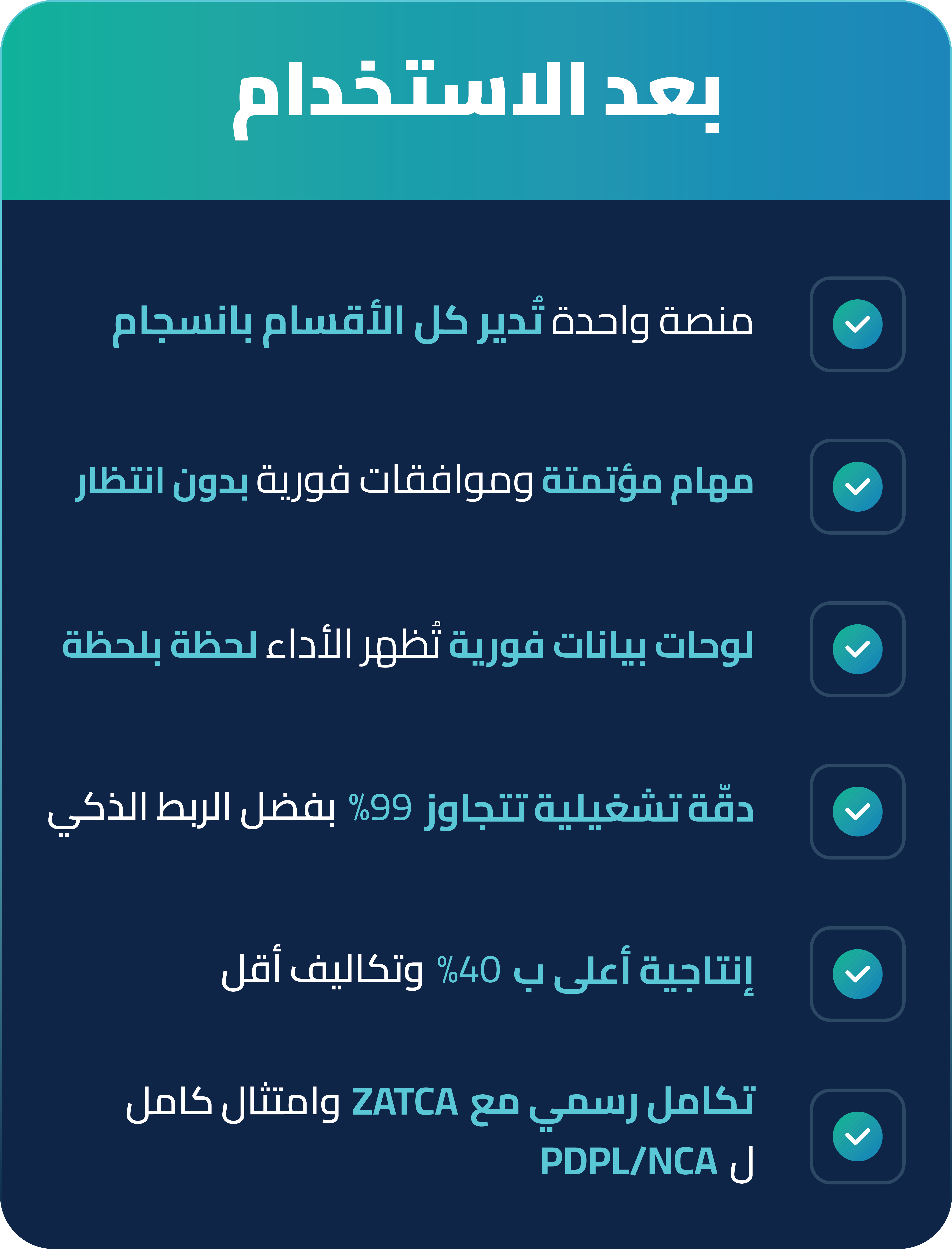 ودّع الفوضى وتعدد الأنظمة. منصة واحدة تنظّم عملياتك وتربط الأقسام بلوحة تحكم ذكية وسهلة الاستخدام.
